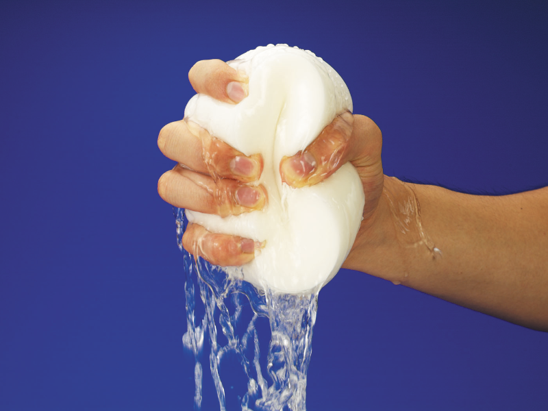 - 乾燥時には硬く、水分を与えると柔らかくなります。水を含んでいる時には、ソフトな風合いと柔軟性、弾力性をもっており、吸水性にも優れています。