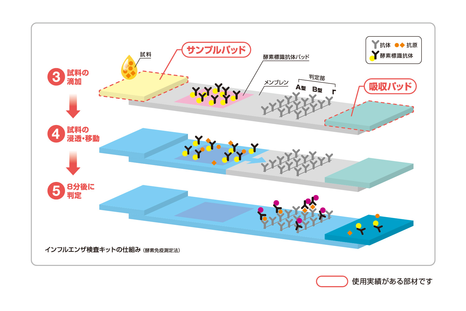 アイオンのPVAスポンジを始めとするPU、POスポンジ多孔質体(ポーラスマテリアル)は、優れた吸水、吸液性能を持ち、各種検査キット特に、インフルエンザ検査キットの吸液材部分に利用いただいています。